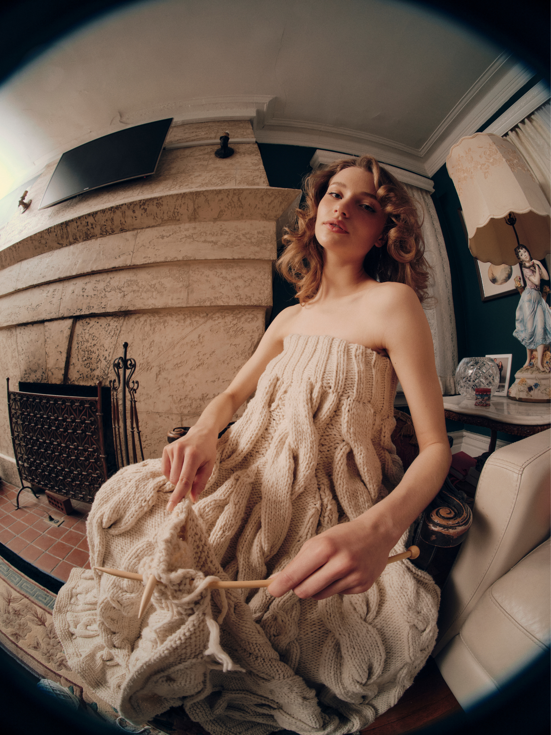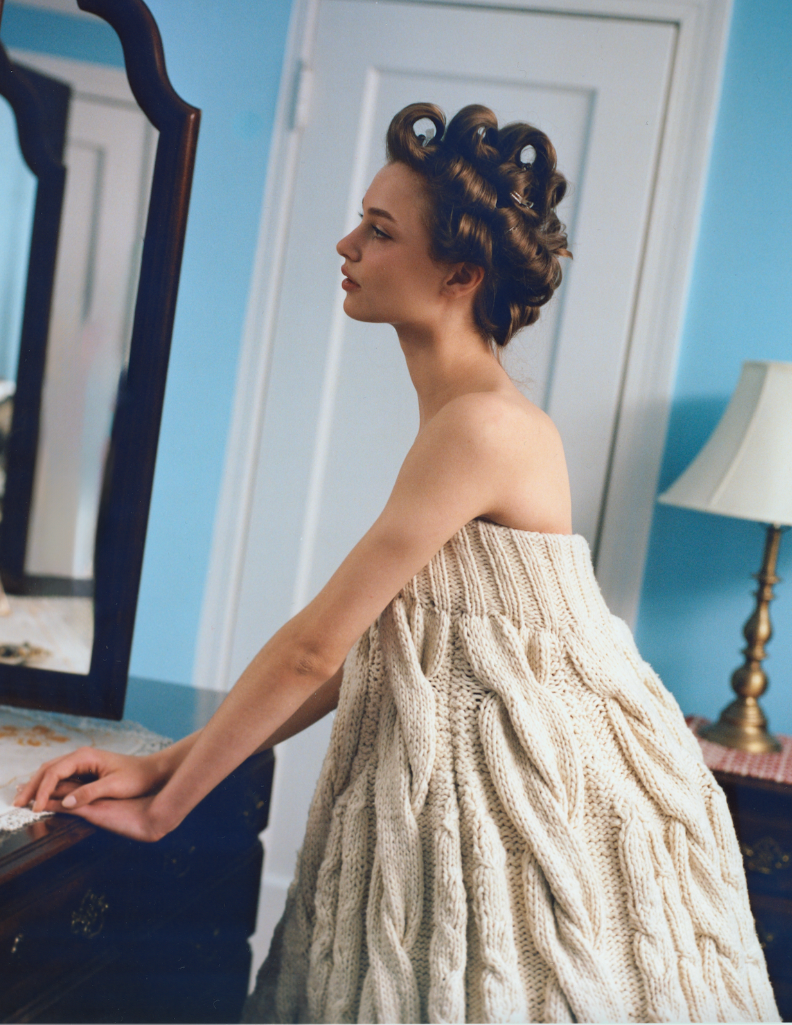 Hand-knit from soft 100% merino wool with dimensional cables and knit braids. Features a garter hem, ribbed strapless neckline, and a removable crinoline to allow for a variety of silhouettes.